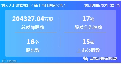 2021年8月25日,股票质押总质押股数204327.04万股,上市公司数15家,股质公告笔数17笔,股东数16个。