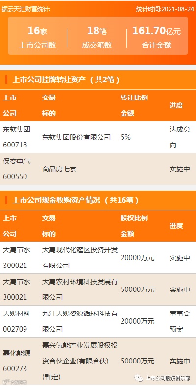 2021年8月24日,资产交易合计金额161.70亿元,上市公司数16家,成交笔数18笔,上市公司挂牌转让资产2笔,上市公司现金收购资产16笔。