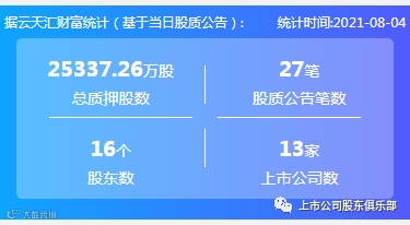 2021年8月4日,股票质押总质押股数255337.26万股,上市公司数13家,股质公告笔数27笔,股东数16个。