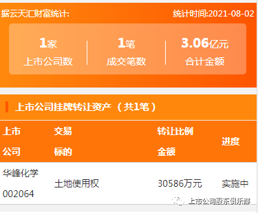 2021年8月2日,资产交易合计金额3.06亿元,上市公司数1家,成交笔数1笔,上市公司挂牌转让资产1笔。