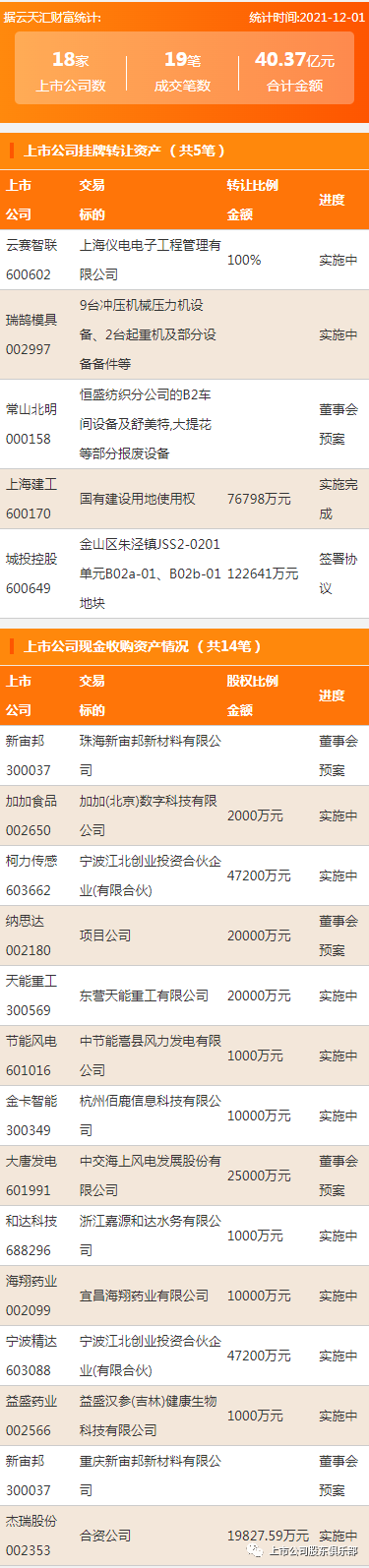 导读:2021年12月01日,资产交易合计金额40.37亿元,上市公司18家,成交19笔,上市公司挂牌转让资产5笔