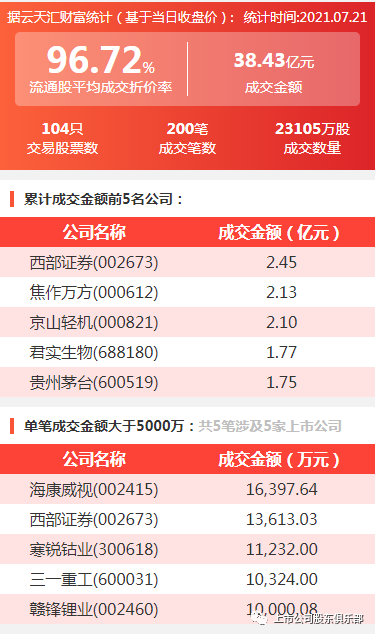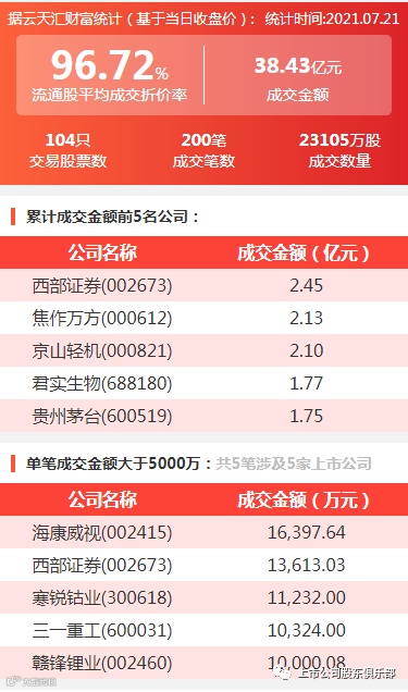 2021年7月21日,大宗交易成交金额38.43亿元,交易股票数104只,成交笔数200笔,流通股平均成交折价率96.72%,成交数量23105万股。