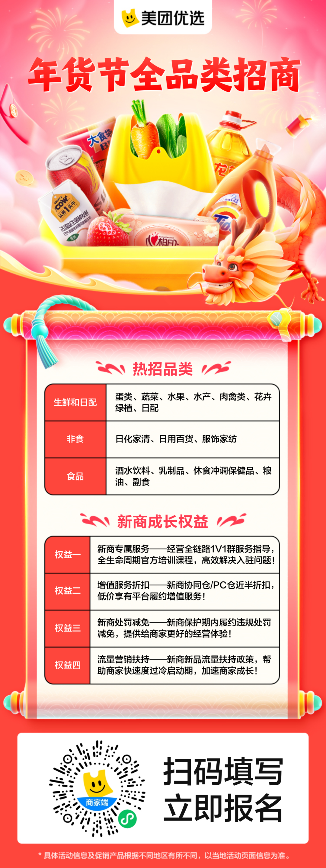 美团优选年货节火热招商进行中,诚邀全国各地果蔬、酒水乳饮、粮油副食及日用百货等品类商家入驻美团优选,入驻美团优选有急速的回款账期、专人的对接服务还有专业的培训团队帮助您更快上手经营!现在入驻还可享受治理减免、仓储物流折扣等新商专属福利!快加入我们成为美团优选供应商,共享新的市场机遇!