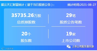 2021年8月27日,股票质押总质押股数35735.26万股,上市公司数19家,股质公告笔数29笔,股东数20个。