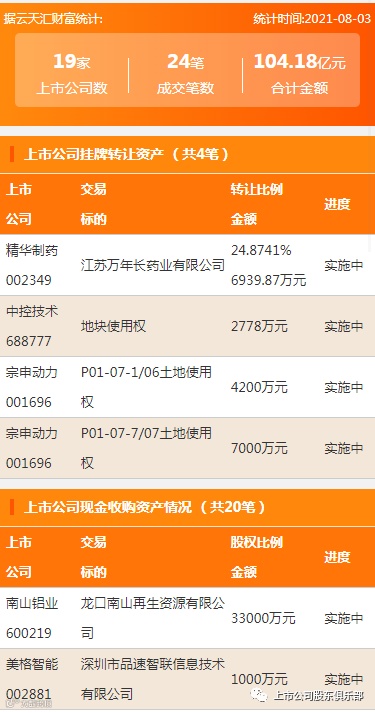2021年8月3日,资产交易合计金额104.18亿元,上市公司数19家,成交笔数24笔,上市公司挂牌转让资产4笔,上市公司现金收购资产20笔。