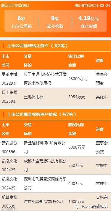 2021年8月4日,资产交易合计金额4.19亿元,上市公司数6家,成交笔数9笔,上市公司挂牌转让资产2笔,上市公司现金收购资产7笔。