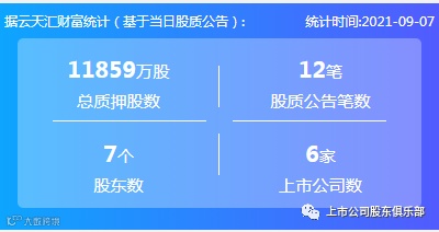 2021年9月7日,股票质押总质押股数11859万股,上市公司数6家,股质公告笔数12笔,股东数7个。