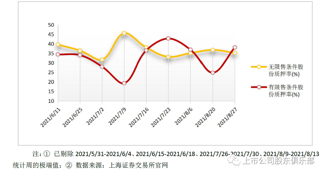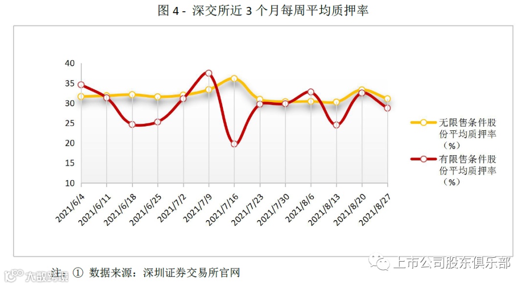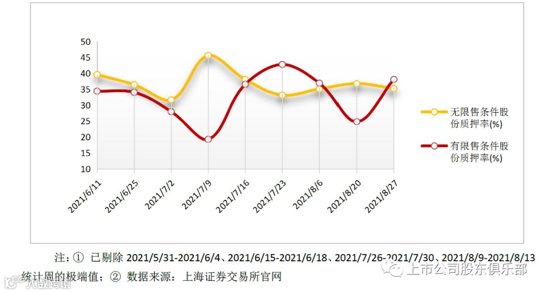 2021年8月最后一个交易周数据显示,上交所无限售股平均质押率为35.21%,限售股平均质押率为38.09%,深交所无限售股平均质押率为31.07%,限售股平均质押率为28.71%。去除交易周的零质押率极端值,将8月份各交易周的质押率进行简单平均,可以发现上交所的无限售股质押率月平均为34.83%,限售股为33.27%;深交所的无限售股质押率月平均为31.25%,限售股为29.62%。相比7月平均值而言,8月份无限售股的质押率略有下降,限售股质押率略有提升。