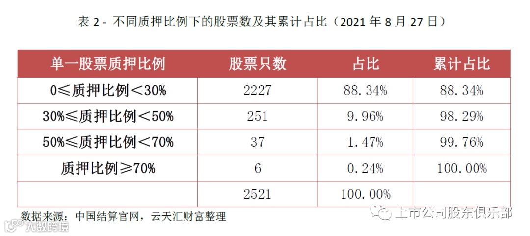 据中国结算2021年8月27日公布的数据显示,共计2521只股票在中国结算有存续质押登记,相比7月减少7只,回到了今年3月末的水平,其中,88.34%的股票全市场质押比例低于30%,98.29%的股票全市场质押比例低于50%。