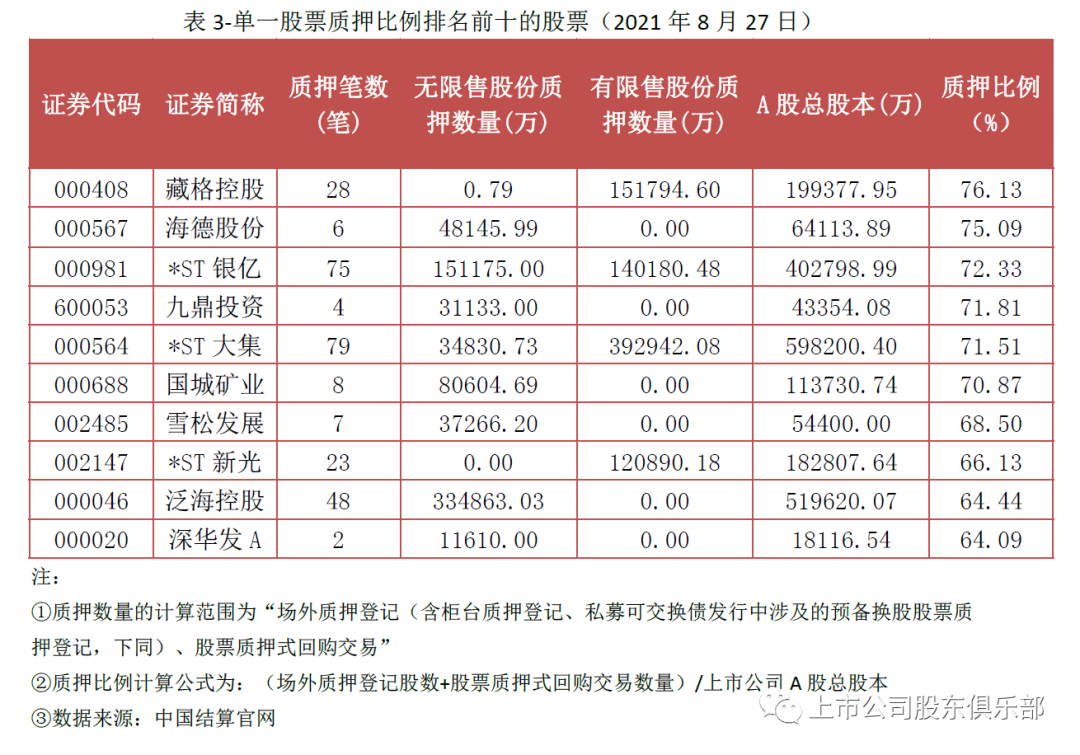 6只股票全市场质押比例超70%,分别是藏格控股(76.13%)、海德股份(75.09%)、*ST银亿(72.33%)、九鼎投资(71.81%)、*ST大集(71.51%)和国城矿业(70.87%),股票及存续质押比例与7月末相比没有变化。