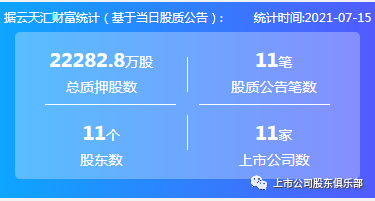 2021年7月15日,股票质押总质押股数22282.8万股,上市公司数11家,股质公告笔数11笔,股东数11个。