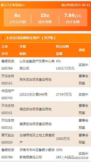 2021年8月11日,资产交易合计金额7.84亿元,上市公司数8家,成交笔数15笔,上市公司挂牌转让资产7笔,上市公司现金收购资产8笔。