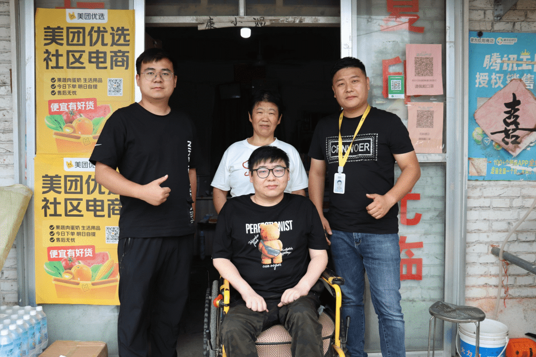△ 美团优选工作人员刘东旭(左)、张前利(右)与优选团长商帅一家
