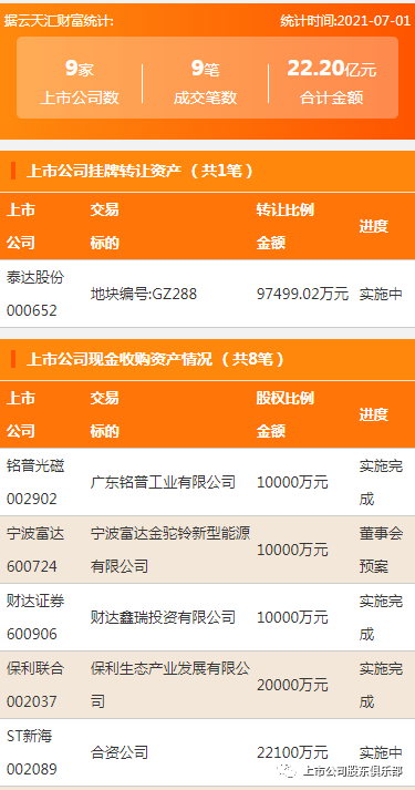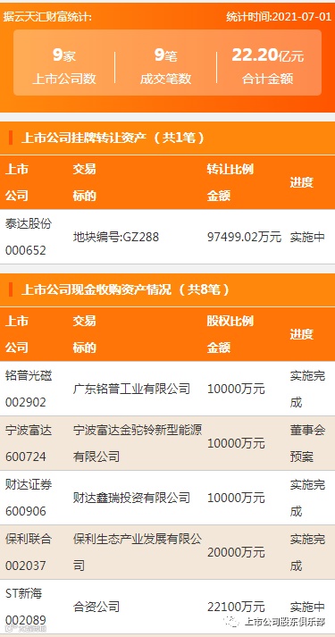 2021年7月1日,资产交易合计金额22.20亿元,上市公司数9家,成交笔数9笔,上市公司挂牌转让资产1笔,上市公司现金收购资产8笔。