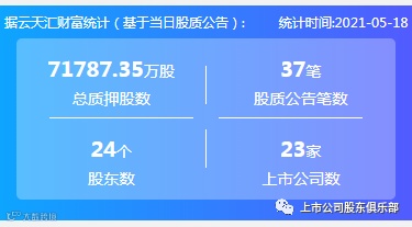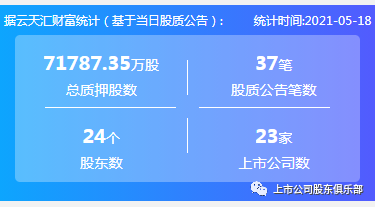 2021年5月18日,股票质押总质押股数71787.35万股,上市公司数23家,股质公告笔数37笔,股东数24个。
