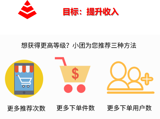 影响等级的指标只有三个(推荐次数、下单用户数、下单总件数),三个指标不绑定,任意一个指标有提升都能增加经营分,最后的经营分决定团长等级。