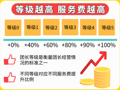 根据团长过去14日的经营表现给予团长一个经营分,不同的经营分会对应不同的等级(V0-V5),而团长等级会对应不同的服务费上调系数,直接影响团长的服务费收入。