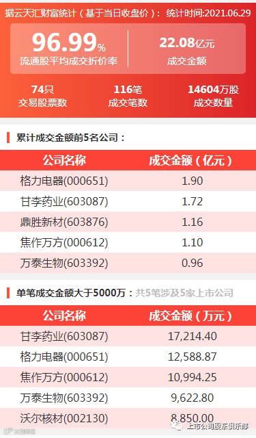 2021年6月29日,大宗交易成交金额22.08亿元,交易股票数74只,成交笔数116笔,流通股平均成交折价率96.99%,成交数量14604万股。