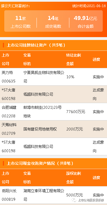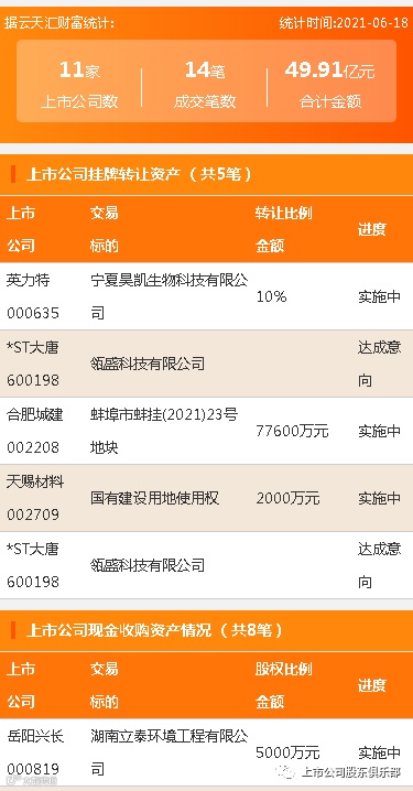 2021年6月18日,资产交易合计金额49.91亿元,上市公司数11家,成交笔数14笔,上市公司挂牌转让资产5笔,上市公司现金收购资产8笔,上市公司发行股份购买资产1笔。