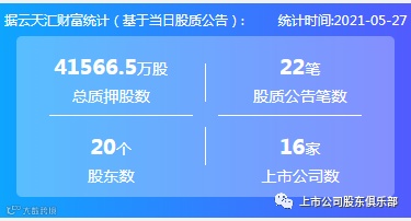 2021年5月27日,股票质押总质押股数41566.5万股,上市公司数16家,股质公告笔数22笔,股东数20个。