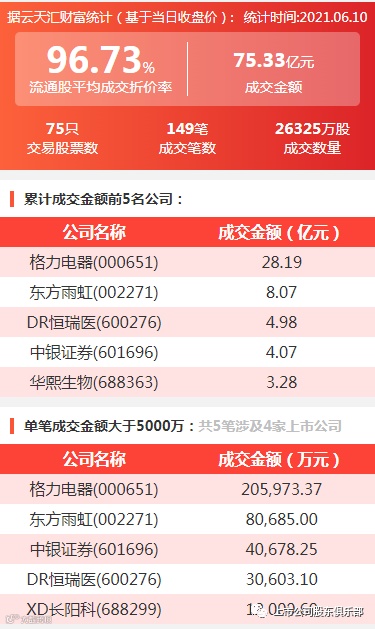 2021年6月10日,大宗交易成交金额75.33亿元,交易股票数75只,成交笔数149笔,流通股平均成交折价率96.73%,成交数量26325万股。