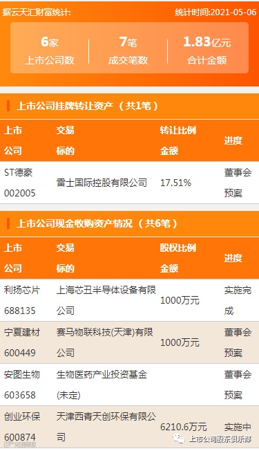 2021年5月6日,资产交易合计金额1.83亿元,上市公司数6家,成交笔数7笔,上市公司挂牌转让资产1笔,上市公司现金收购资产6笔。