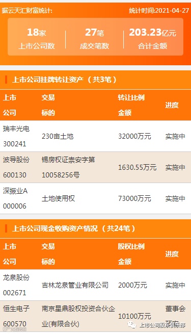 2021年4月27日,资产交易合计金额203.23亿元,上市公司数18家,成交笔数27笔,上市公司挂牌转让资产3笔,上市公司现金收购资产24笔。