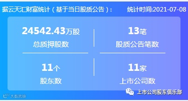 2021年7月8日,股票质押总质押股数24542.43万股,上市公司数11家,股质公告笔数13笔,股东数11个。