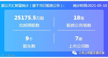 2021年5月10日,股票质押总质押股数25175.5万股,上市公司数7家,股质公告笔数18笔,股东数9个。