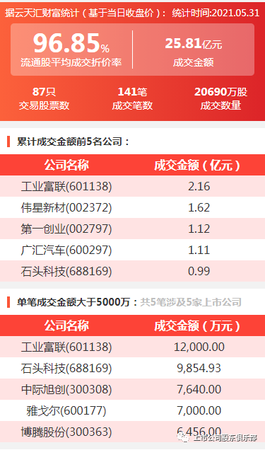 2021年5月31日,大宗交易成交金额25.81亿元,交易股票数87只,成交笔数141笔,流通股平均成交折价率96.85%,成交数量20690万股。