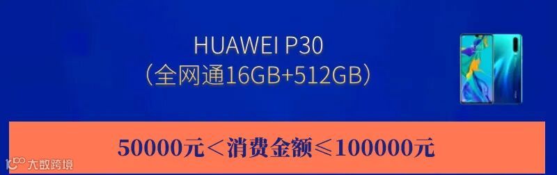5、50000元<消费金额≤100000元,奖励华为手机1部(HUAWEI P30)