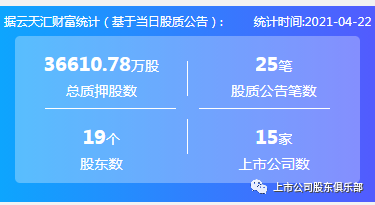 2021年4月22日,股票质押总质押股数36610.78万股,上市公司数15家,股质公告笔数25笔,股东数19个。