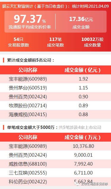 2021年4月9日,大宗交易成交金额17.36亿元,交易股票数54只,成交笔数117笔,流通股平均成交折价率96.37%,成交数量10032万股。