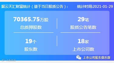 2021年1月29日,股票质押总质押股数70365.75万股,上市公司数18家,股质公告笔数29笔,股东数19个。