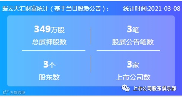 2021年3月8日,股票质押总质押股数349万股,上市公司数3家,股质公告笔数3笔,股东数3个。