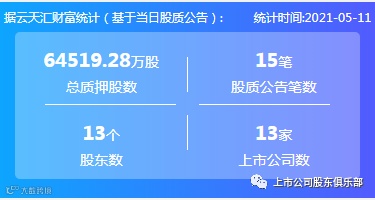 2021年5月11日,股票质押总质押股数64519.28万股,上市公司数13家,股质公告笔数15笔,股东数13个。