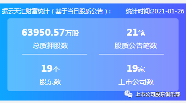 2021年1月26日,股票质押总质押股数63950.57万股,上市公司数19家,股质公告笔数21笔,股东数19个。