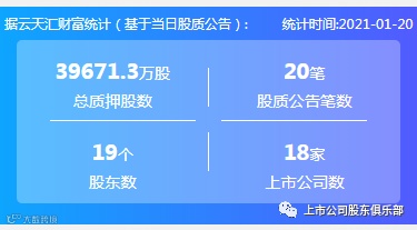 2021年1月20日,股票质押总质押股数39671.3万股,上市公司数18家,股质公告笔数20笔,股东数19个。