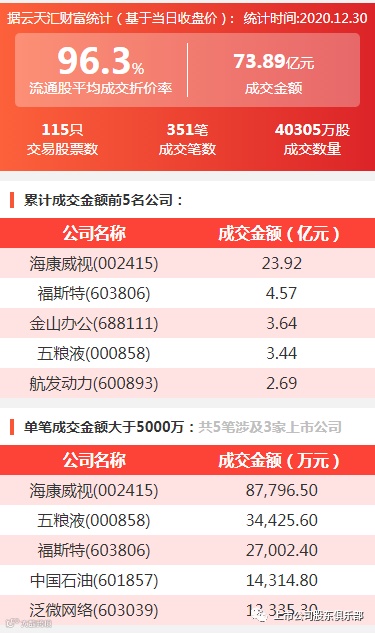 2020年12月30日,大宗交易成交金额73.89亿元,交易股票数115只,成交笔数351笔,流通股平均成交折价率96.3%,成交数量40305万股。