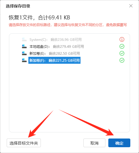 5.选择好保存位置后点击【确定】,建议将恢复的数据保存到不同于原位置的其他驱动器,避免数据被覆盖;