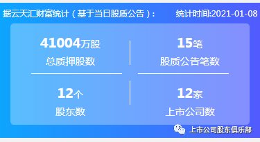2021年1月8日,股票质押总质押股数41004万股,上市公司数12家,股质公告笔数15笔,股东数12个。