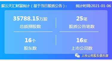 2021年1月6日,股票质押总质押股数35788.15万股,上市公司数16家,股质公告笔数25笔,股东数16个。
