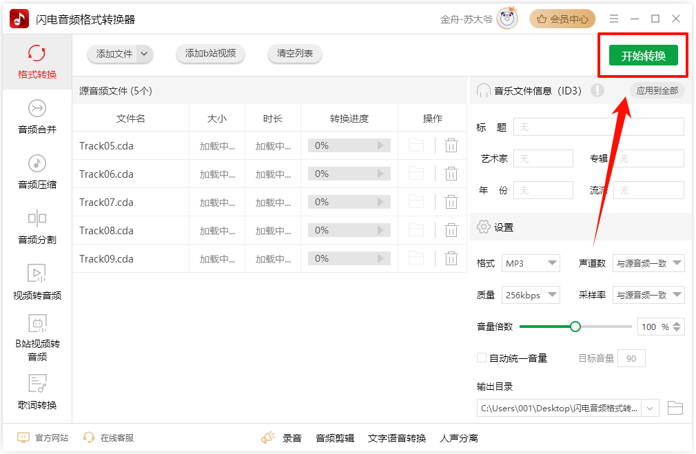 ② 选择导出音频格式“mp3”,同时还可以设置音频质量、音量、声道数等参数。设置完成直接点击“开始转换”。