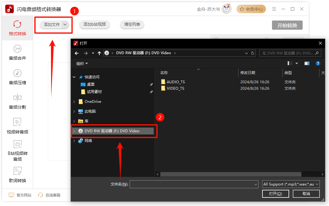 ① 运行闪电音频格式转换器,主页面选择“格式转换”。点击“添加文件”,选择连接到电脑的CD光驱。