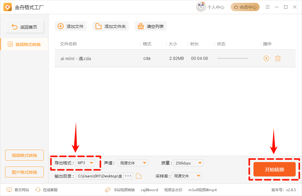 ② 在下方设置中选择导出的音频格式“mp3”,同时还可以设置音频质量:声道数和输出目录等。设置完成,点击“开始转换”,等待转换完成即可。