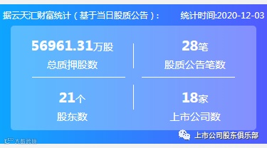2020年12月3日,股票质押总质押股数56961.31万股,上市公司数18家,股质公告笔数28笔,股东数21个。