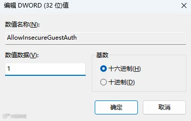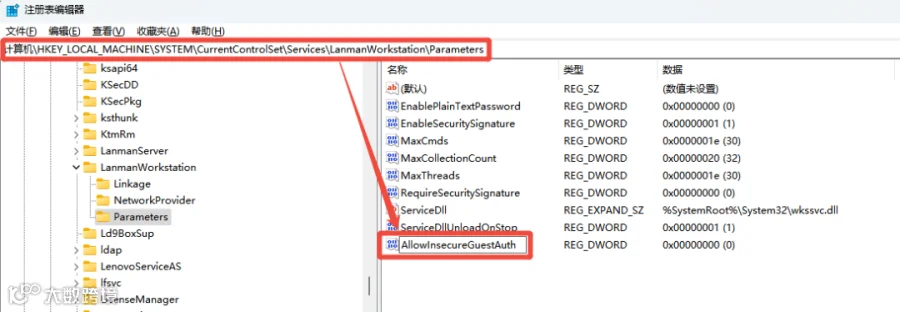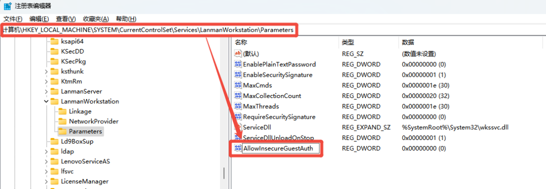 第2步:在右侧窗格中,查找或新建名为“AllowInsecureGuestAuth”的DWORD值;