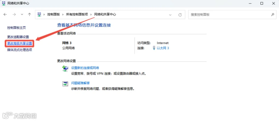 第1步:打开“控制面板” > “网络和共享中心” > “高级共享设置”。