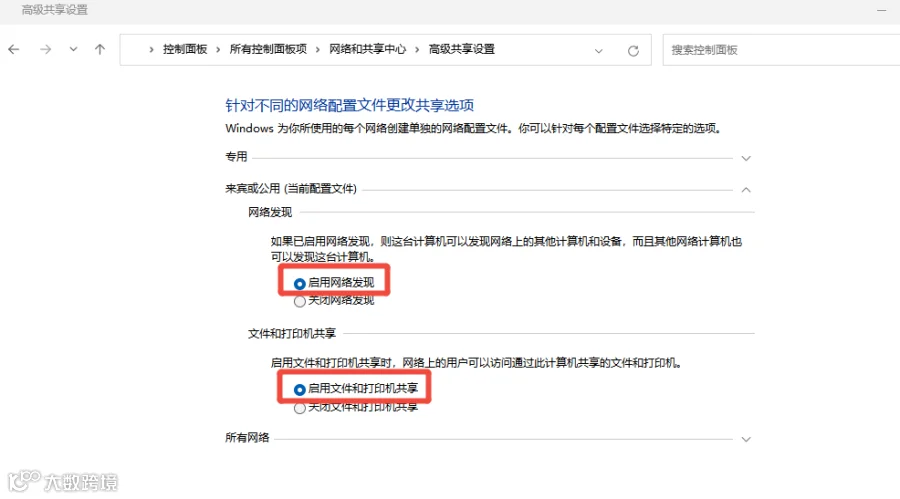第2步:确保当前网络配置文件下的“启用网络发现”和“启用文件和打印机共享”选项已勾选。