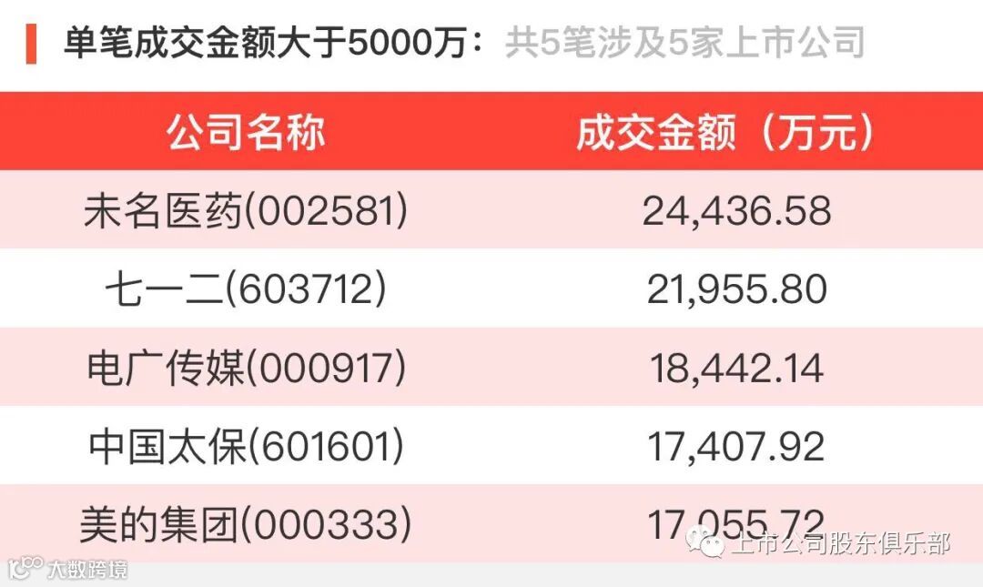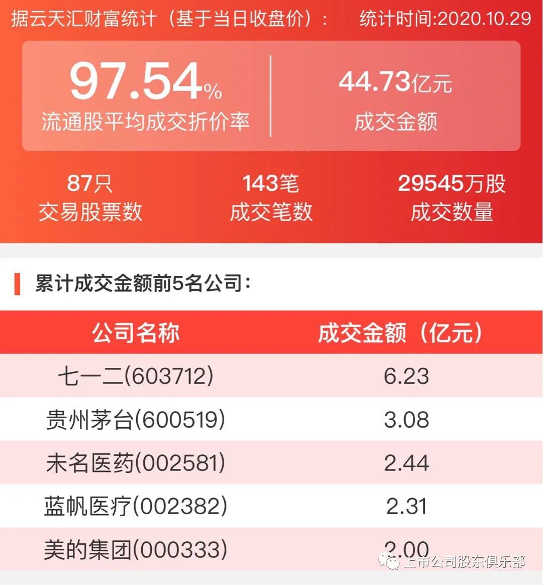 2020年10月29日,大宗交易成交金额44.73亿元,交易股票数87只,成交笔数143笔,流通股平均成交折价率97.54%,成交数量29545万股。